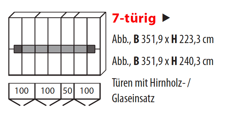 • Gesamtbreite in cm: 3-türig 151,9 / 4-türig 201,9 / 5-türig 251,9 / 6-türig 301,9 / 7-türig 351,9