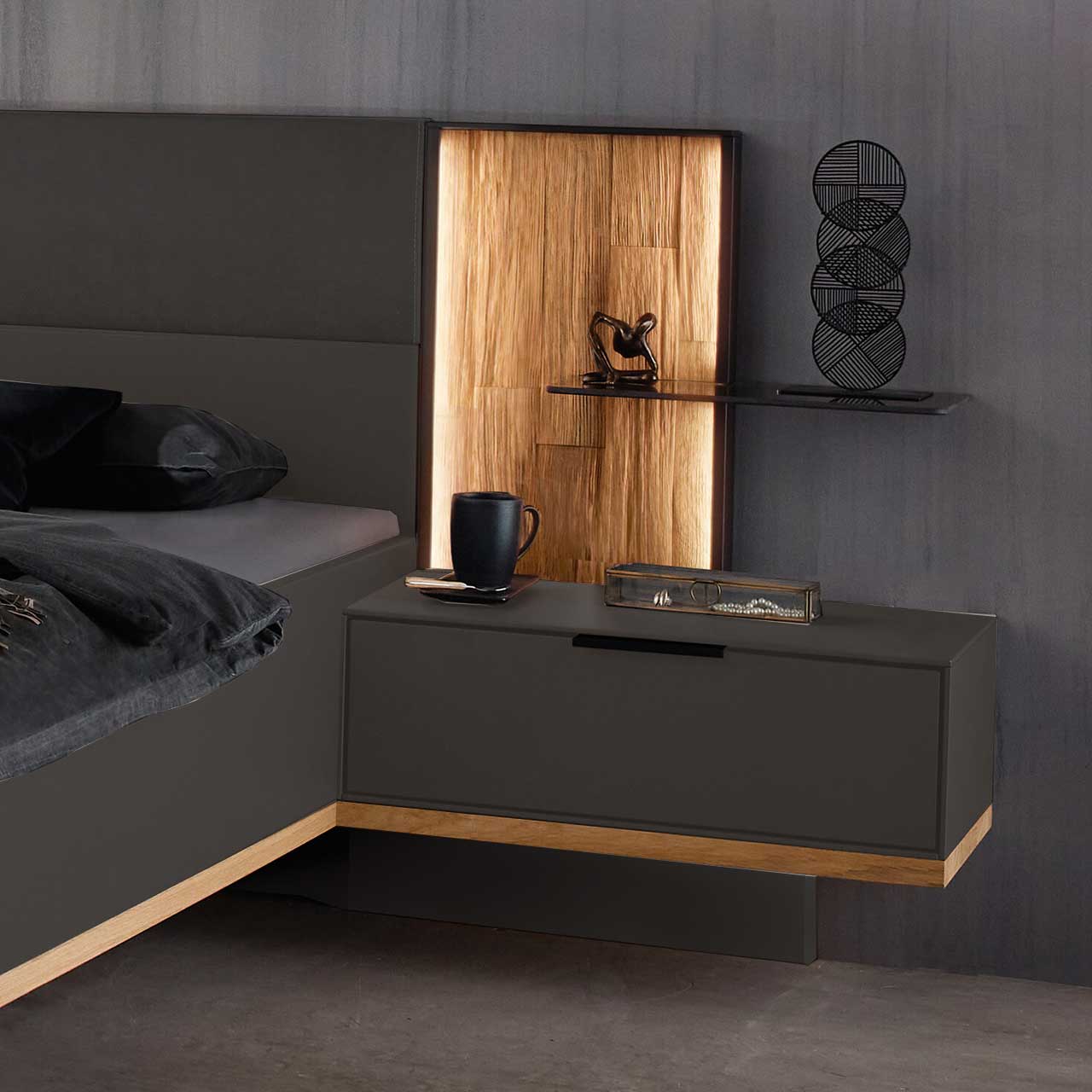 - Passepartout, Nako-Ablage, unterer Bettrahmen und Sitzbank: Wildeiche massiv, soft gebürstet