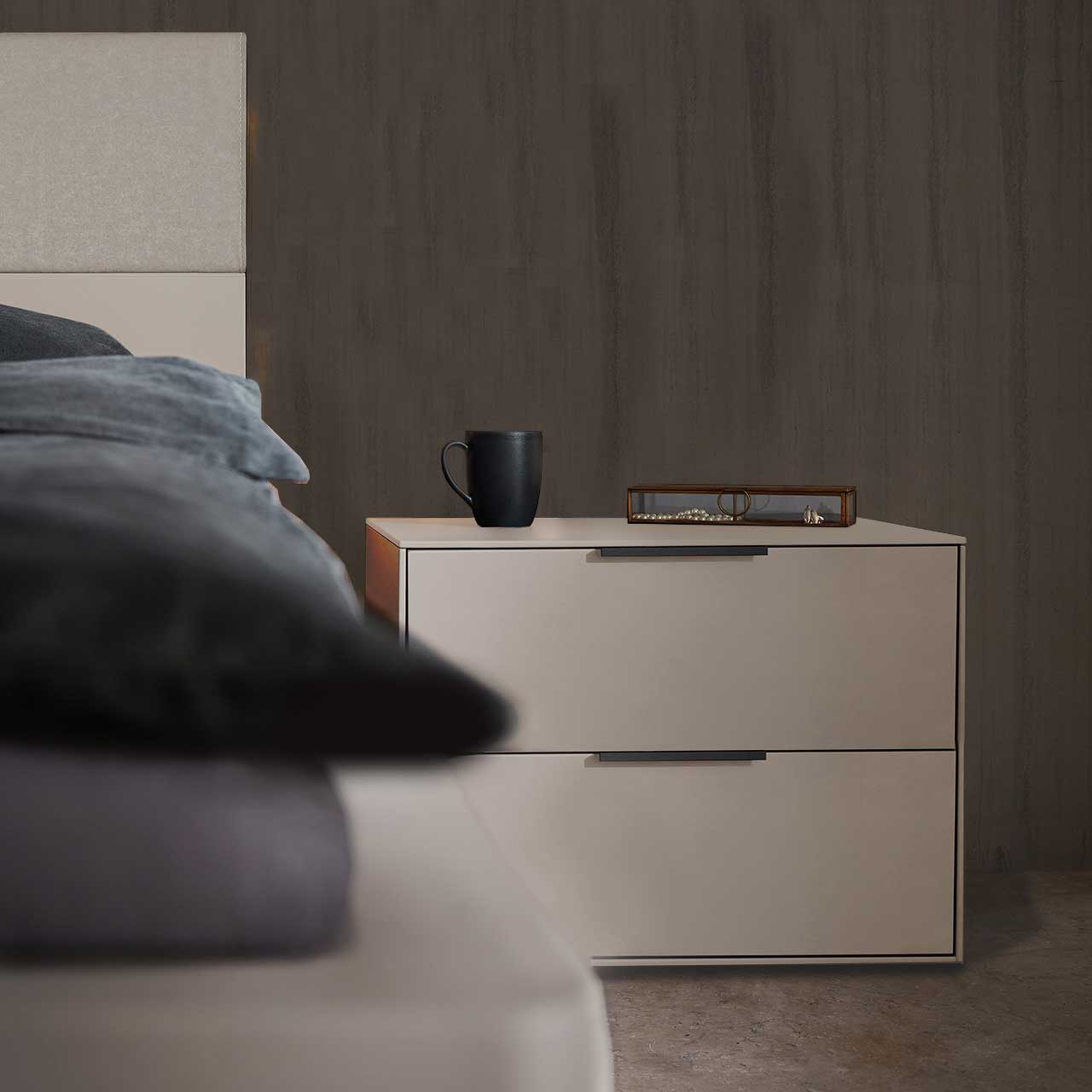 Akzent Bett, Paneelaufsatz, Schrank & Kommode